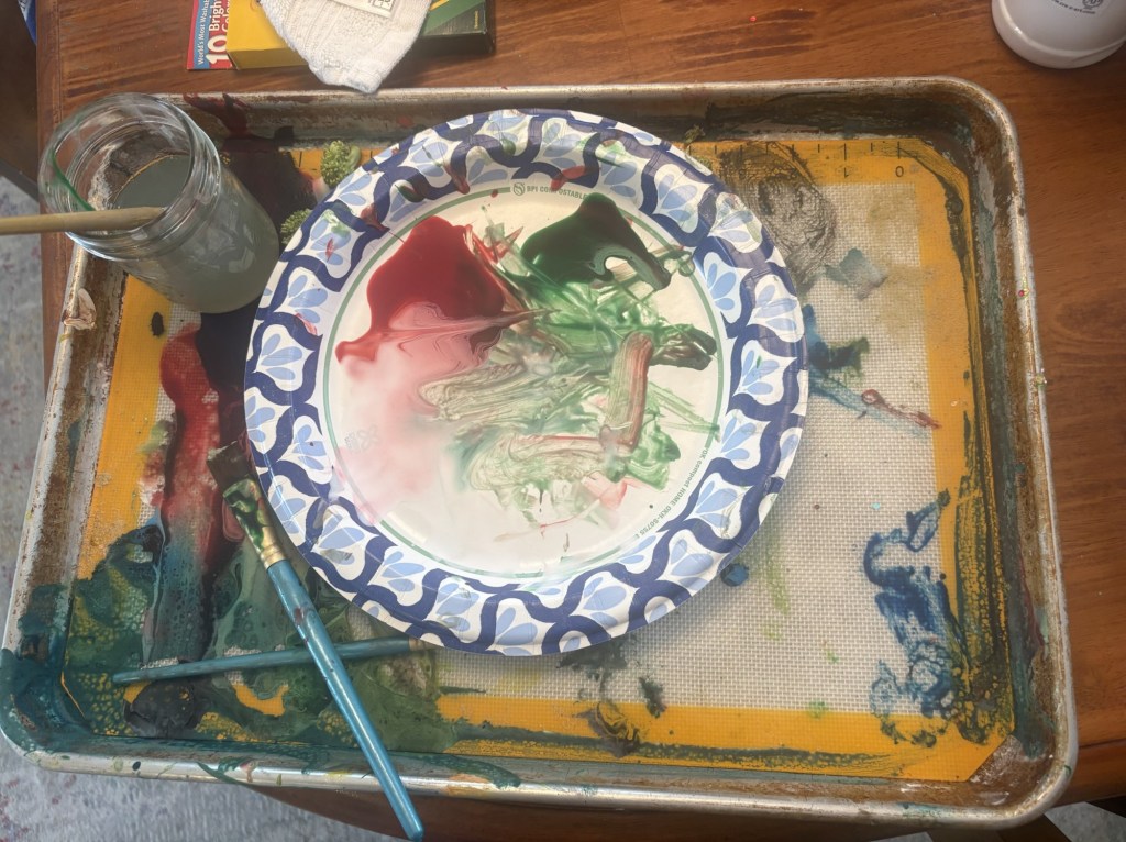Silpat mats and rimmed cookie sheets are Grandma School essentials. They turn any table into a mess-friendly workspace—perfect for kinetic sand, paints, slime, glue, etc. Everything stays on the tray, and when we’re done, I just lift, rinse, and we’re back to clean in a minute.