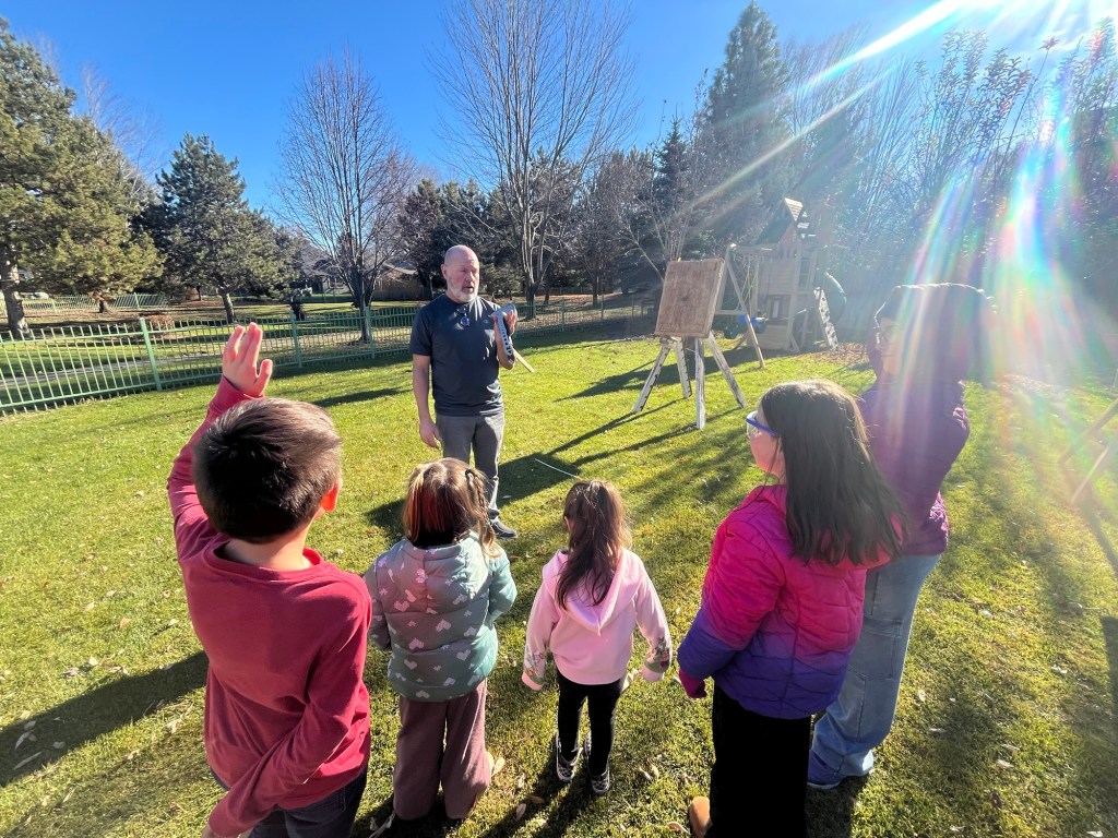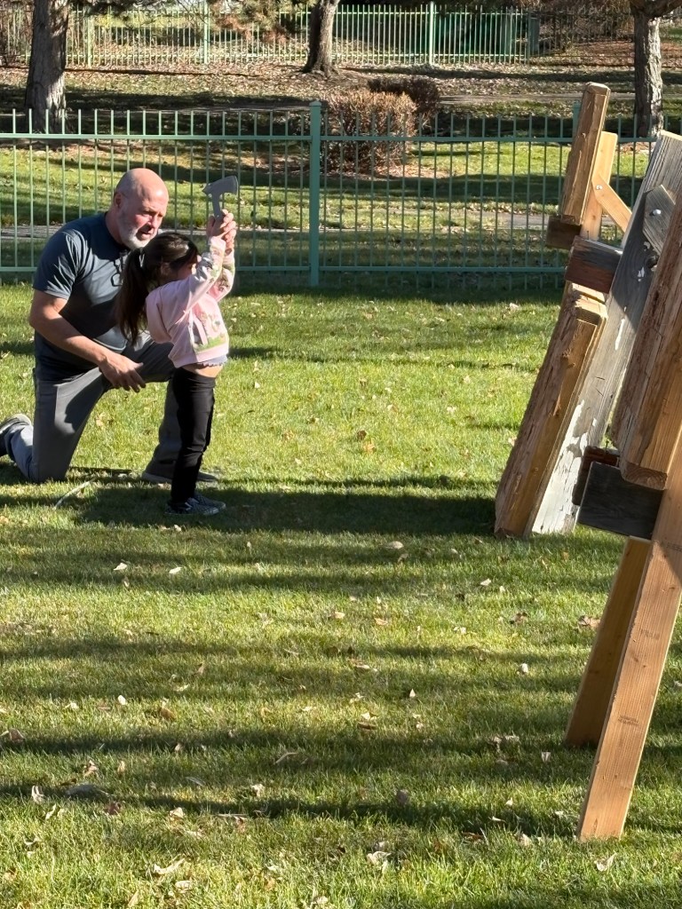 He taught them how to safely throw axes. This takes a lot of patience and strict rules, but they all handled themselves well. He loves to teach this skill because the success rate is so high and it builds confidence. He has built all the bullseyes and teaches this skill to several youth groups all year long.