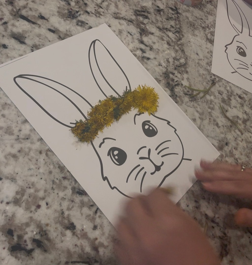 Apply two sided tape to bunny picture and apply dandelions to the tape to form a crown.